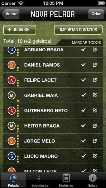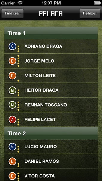 O Pelada Maker tem os recursos básicos para pôr ordem nas partes mais chatas da pelada - quando a bola não rola. Cadastre os jogadores (com a opção de importá-los da agenda do aparelho), classifique o nível técnico e posição de cada um, depois defina quantos jogadores cada time tem e pressione o botão Criar pelada.
